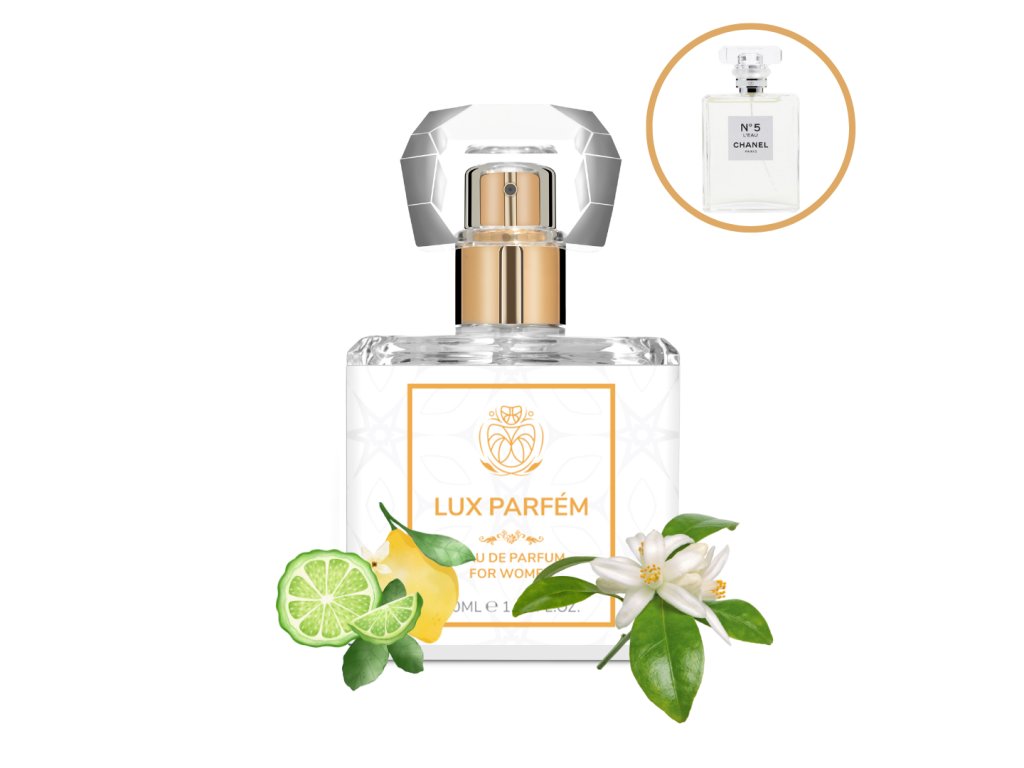 Náš parfém je inšpirovaný vôňou Chanel No 5 L'Eau. Vrchné tóny sú citrón, mandarínka, pomaranč, neroli, aldehydy, bergamot a limetka, stredné tóny sú májová ruža, jazmín a ylang-ylang a základ tvorí céder, biele pižmo, vanilka a koreň kosatca.
